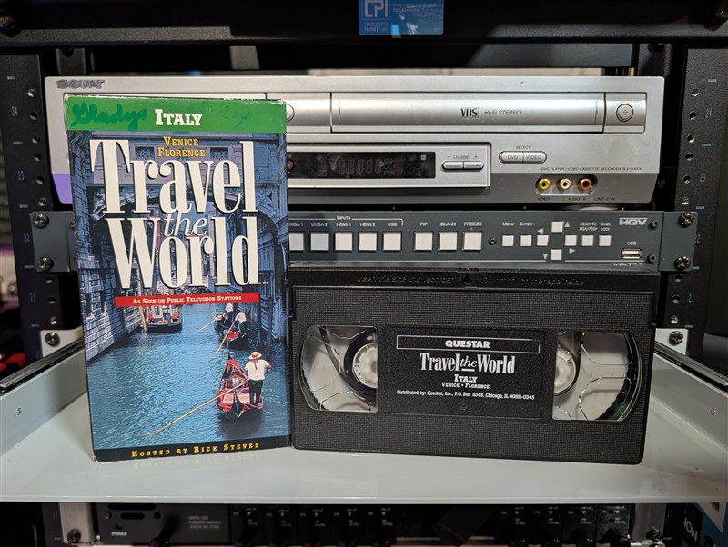 Tape ID: VHS-2025-043. Part of the 2025 intake. Questar Video, Inc. — a Chicago-based company that produced travel documentaries for the PBS home video market through the 1980s and 90s. This tape is from their “Travel the World” series, the Italy episode. Runtime: 120 minutes in SP mode.