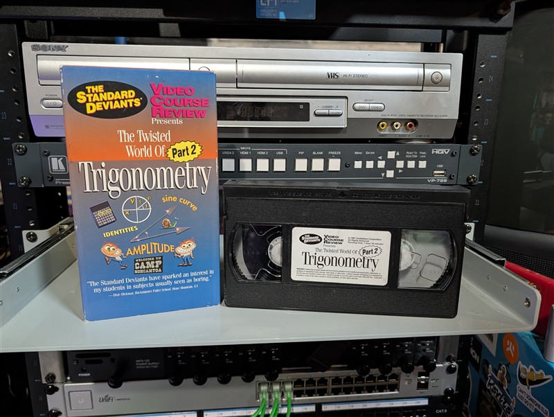 VHS-2025-039 is Part 2 of “The Twisted World of Trigonometry” from Cerebellum Corporation — a late-90s educational video series that taught high school and college concepts through comedy sketches, costumes, and an ensemble cast of college students who were clearly having a better time than their audience.