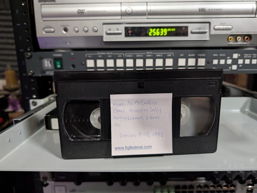 An unmarked T-120 from the Sunbury Collection. Six hours in EP mode from February 8-18, 1990. Recorded off WEWS Channel 5, Cleveland’s ABC affiliate. The label lists: Home, All My Children, Oprah, Arsenio on Sally, Morning Exchange, 5 News, America’s Funniest Home Videos. That’s the optimistic reading. What’s actually on it is considerably more chaotic.